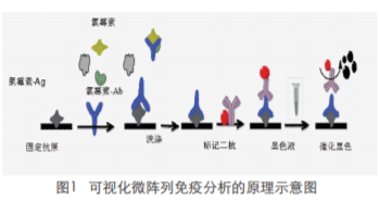 本論文采用的 是間接競爭微陣列免疫分析原理,見圖1。在微 陣列免疫分析中,進行了以下實驗過程。每孔中 加入25 µL標準品或樣品,再加入已知量的25 µL 混合抗體,25 ℃振蕩反應30 min(振蕩速度600 r/ min)。清洗后再加入50 µL AgNPS標記的羊抗鼠 IgG,37 ℃振蕩反應30 min(振蕩速度600 r/min)。 洗滌后再加入50 µL銀增強顯色溶液(包括溶液A和 溶液B),在37 ℃中避光反應12 min。顯色反應結(jié)束后,再清洗3次。