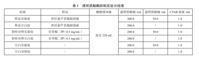 透明質(zhì)酸酶能將大分子的透明質(zhì)酸水解成低 分子化合物,未水解的透明質(zhì)酸會(huì)與十六烷基三甲 基溴化銨(CTAB)形成不溶物,而水解后的低分子 化合物不會(huì)。通過(guò)測(cè)定 405 nm 處的濁度值,可以 反映透明質(zhì)酸酶的活性。 實(shí)驗(yàn)設(shè)置:將庫(kù)拉索蘆薈凝膠粉按照 16.5、 33、82.5 和 165 mg/mL 的質(zhì)量濃度進(jìn)行分組,每 個(gè)實(shí)驗(yàn)分組按表 1 進(jìn)行操作。