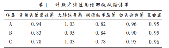 供 試 液 制 備 : 取 各 樣 品 10 mL,分 別 加 入 90 mL pH 7. 0 無菌氯化鈉 - 蛋白胨緩沖液,45 ℃ 恒溫振蕩 15 min,制成 1 ∶ 10( V ∶ V) 的供試液。 計(jì)數(shù)方法適用性試驗(yàn): 取 5 種供試液,分裝于 5 個(gè) 無菌試管中,每管裝量 9. 9 mL,再分別加入含菌量不大于 104 cfu / mL 的金黃色葡萄球菌、銅綠假單胞菌、大腸埃 希菌、白色念珠菌、黑曲霉試驗(yàn)菌液 0. 1 mL。用 0. 1 mL pH 7. 0 無菌氯化鈉 - 蛋白胨緩沖液代替菌液同法制備 供 試 品 對 照 組 ,以 及 不 加 樣 品 的 菌 液 對 照 組。分 別 吸 取試驗(yàn)組、供試品對照組、菌液對照組液體各 1 mL, 置直徑90 mm 的無菌平皿中,平行 2 份,細(xì)菌注入約 20 mL 溫度不超過 45 ℃融化的 TSA 培養(yǎng)基,搖勻,凝固 后置 35 ℃ 倒置培養(yǎng) 2 ~ 3 d; 真菌注入約 20 mL 不超過 45 ℃ 融化的 SDA 培養(yǎng)基,搖勻,凝固后置 25 ℃ 倒置 培養(yǎng) 3 ~ 5 d。 計(jì)數(shù)方法適用性試驗(yàn)回收率: 試驗(yàn)組菌落數(shù)減去供 試品對照組菌落數(shù)的值與菌液對照組菌落數(shù)的比值計(jì)算 回收率,結(jié)果見表 1。各試驗(yàn)菌的回收率均在 0. 8 ~ 1. 0 范圍內(nèi),符合要求,說明抑菌效力試驗(yàn)中的微生物存活 菌落數(shù)的測試可采用平皿法( 1 ∶ 10,1 mL) 進(jìn)行。