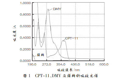 用 甲 醇 配 制 CPT-11、 DMY 和輔料(空白脂質(zhì)體)等溶液,使用紫外分光 光度計在 190~600nm 處進行波長掃描,掃描結果見圖1。