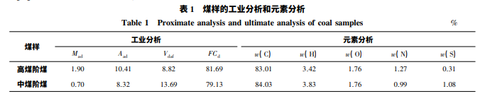 試驗所用煤樣有 2 種,分別是取自山西省中南 部沁水盆地的高煤階煤和山西省左權縣的中煤階 煤。將樣品破碎研磨,過 0.15 mm( 100 目) 篩,在 45 ℃下干燥 6 h 待用,2 種煤樣的工業(yè)分析和元素分析 結果見表 1。試驗所用菌種由沁水盆地煤層氣田產 出水經過富集得到。試驗所用培養(yǎng)基主要包括微量 元素、維 生 素、基 礎 培 養(yǎng) 基 和 半 胱 氨 酸 - 硫 化 鈉 溶液。