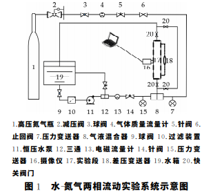 為滿足實(shí)驗(yàn)條件,作者設(shè)計(jì)并搭建了如圖1所 示的兩相流實(shí)驗(yàn)臺(tái).實(shí)驗(yàn)系統(tǒng)由循環(huán)水回路、氣路、 實(shí)驗(yàn)段以及測量系統(tǒng)等組成.從高壓氮?dú)馄苛鞒龅?氮?dú)庖来谓?jīng)過減壓閥、高精度針閥、氣體質(zhì)量流量 計(jì)、截止閥和混合器( 旋渦混合器VORTEX-5,海門市其林貝爾提供),水箱內(nèi)的水依次流經(jīng)過濾器、 變頻恒壓水泵、電 磁 流 量 計(jì) 和 混 合 器.混 合 后 的 氮 氣-水兩相流體流經(jīng)實(shí)驗(yàn)段,實(shí)驗(yàn)段流出的水和氮 氣分別排入水箱和空氣.