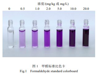 將甲醛標(biāo)準(zhǔn)溶液配制成 0、0.5、1、2、5、10、20 mg/L 濃度的甲醛標(biāo)準(zhǔn)系列工作液, 同樣品按照 AHMT 比色卡法 測(cè)定, 得到濃度系列為 0、5、10、20、50、100、200(mg/kg或 mg/L)甲醛標(biāo)準(zhǔn)比色卡, 見圖 1