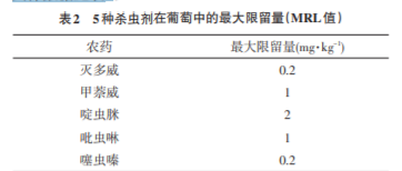 我國(guó)農(nóng)產(chǎn)品中農(nóng)藥殘留限量標(biāo)準(zhǔn)中對(duì)葡萄類漿果等小型水果中滅多威、啶蟲(chóng)脒做出了殘留 限量規(guī)定而對(duì)于葡萄中的甲萘威、吡蟲(chóng)啉和噻蟲(chóng)嗪3種殺 蟲(chóng)劑的殘留并沒(méi)有做出專門的規(guī)定,所以甲萘威、吡蟲(chóng)啉 參考一些國(guó)家和國(guó)際衛(wèi)生組織中對(duì)其在葡萄中的最大限 留量的規(guī)定,而噻蟲(chóng)嗪在葡萄中的最大限留量在國(guó)內(nèi) 外標(biāo)準(zhǔn)中均未規(guī)定,結(jié)合參考相關(guān)文獻(xiàn)中使用的標(biāo)準(zhǔn)。 具體數(shù)據(jù)見(jiàn)表2