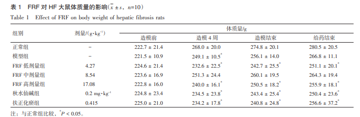 結果見表 1。實 驗造模前各組大鼠體質量比較,差異無統(tǒng)計學意義 (P>0.05)。造模 4 周時,各造模組體質量均低于正 常組,除 FRF 中劑量組外,差異均有統(tǒng)計學意義 (P <0.05);各造模組間比較,差異無統(tǒng)計學意義 (P>0.05)。造模 8 周結束時,各造模組體質量仍低 于正常組,除模型組、FRF 中劑量組外,差異均有 統(tǒng)計學意義(P < 0.05);各造模組間比較,差異無統(tǒng) 計學意義(P>0.05)。藥物干預 4 周結束時,各藥物 干預組體質量仍低于正常組,除模型組、FRF 中劑 量組外,差異均有統(tǒng)計學意義(P < 0.05);但與模型 組比較,各給藥組的體質量差異無統(tǒng)計學意義(P> 0.05)。提示 HF 造模能影響大鼠體質量,但陽性藥 及 FRF 的干預作用不明顯。正常組比較,模型組的 ALT、AST、γ-GGT、TBIL 含量顯著增高(P < 0.05,P < 0.01),ALB 含量顯著 降低(P < 0.01)。與模型組比較,F(xiàn)RF 各劑量組的 ALT、AST、TBIL 均顯著下降(P < 0.05,P < 0.01), ALB 含量顯著升高(P < 0.05,P < 0.01),F(xiàn)RF 中、 高劑量組的 γ-GGT 顯著下降(P < 0.05,P < 0.01)。Masson 切片顯示正常組僅于匯管區(qū)有少量藍染的膠原纖維分布,無明顯膠原增生。與正常組 比較,模型組大鼠的門管區(qū)藍染纖維組織增多,中 央靜脈壁增厚,多數(shù)大鼠藍染的纖維組織自門管區(qū) 或中央靜脈向外延伸,少數(shù)大鼠有纖維隔形成,呈 藍染;HF 程度分級經(jīng)非參數(shù)檢驗,與正常組比較差 異有統(tǒng)計學意義(P<0.01)。與模型組比較,給藥組 大鼠的肝纖維組織增生程度均有不同程度的減輕, 膠原纖維減少、變細;肝纖維化程度分級,除 FRF 低劑量組外,差異均有統(tǒng)計學意義(P<0.01)。