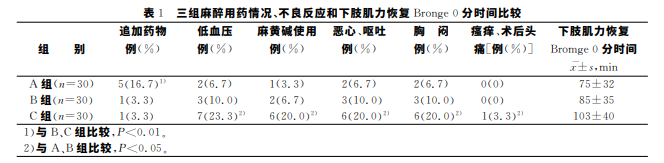 產(chǎn)婦入室后行血氧飽和度(SpO2)、心率(HR)、 呼吸(R)、心 電 圖(ECG)常 規(guī) 監(jiān) 測(cè)。麻 醉 前 給 予 復(fù) 方乳酸林格氏液8~10mL/kg,三組產(chǎn)婦均在左側(cè) 臥位下 于 L2~3或 L3~4間隙行針內(nèi)針腰麻穿刺術(shù)。 配制等比重腰麻藥物方法:取0.75%布比卡因2mL加腦脊液至3mL,A 組注射1.2mL(0.5%布比卡 因6mg),B 組 注 射 1.5 mL(0.5% 布 比 卡 因 7.5 mg),C組注射1.8mL(0.5%布比卡因9mg),推注 時(shí)間均為10s,給藥后留置硬膜外導(dǎo)管備用,平臥后 向左側(cè)搖床傾斜15°,常規(guī)預(yù)防仰臥位綜合征。采 用針刺法測(cè)試產(chǎn)婦疼痛消失的阻滯平面,痛 覺(jué) 消 失 達(dá) T8 以上開(kāi) 始 手 術(shù);5min內(nèi) 未 達(dá) 到 此 平 面 時(shí),用 1.5%鹽酸利多 卡 因 以3mL 為單位通過(guò)硬膜外導(dǎo) 管注入硬膜外腔,使平面達(dá)到 T8 以上。術(shù)中監(jiān)測(cè)如 發(fā)現(xiàn)產(chǎn)婦出現(xiàn)低血壓[SBP<90mmHg或者平均動(dòng) 脈 壓 (MAP)低 于 基 礎(chǔ) 血 壓 的20% ](1mmHg= 0.133kPa),或伴有惡心嘔吐、胸悶不適主訴時(shí)給予 麻黃堿靜脈注射;產(chǎn)婦在術(shù)中有疼痛或手術(shù)者感覺(jué) 腹肌緊張影響手術(shù)為硬膜外追加藥物的特征,所 有 產(chǎn)婦術(shù)畢常規(guī)給予靜脈鎮(zhèn)痛泵止痛。