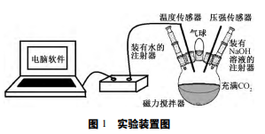 本案例選取于某實(shí)驗(yàn)教學(xué)設(shè)計(jì)比賽的初中 化學(xué)作品之一。 【微 課 主 題】數(shù) 形 結(jié) 合 下 NaOH 與 CO2 反應(yīng)( 科教版九年級(jí)化學(xué)) 【教材分析】NaOH 與 CO2 的相關(guān)知識(shí)是九 年級(jí)化學(xué)中教師教學(xué)與學(xué)生學(xué)習(xí)的重點(diǎn),亦是 歷年中考中實(shí)驗(yàn)題或其他題型的考查重點(diǎn)。關(guān) 于如何直觀地檢驗(yàn) NaOH 與 CO2 反應(yīng),相關(guān)試 題多是從實(shí)驗(yàn)裝置的變化,或利用檢驗(yàn)生成的 Na2CO3 等方法。這些方法多是從定性的角度 來(lái)剖析檢驗(yàn) NaOH 與 CO2 反應(yīng),但是對(duì)于部分 學(xué)生理解仍然較為困難。手持技術(shù)的應(yīng)用,將 NaOH 與 CO2 反應(yīng)變化的定性現(xiàn)象與定量現(xiàn)象 相結(jié)合,不僅有助于學(xué)生的理解,更有助于培養(yǎng) 學(xué)生定量分析實(shí)驗(yàn)圖表、實(shí)驗(yàn)數(shù)據(jù)的能力。 【學(xué)情分析】在經(jīng)過(guò)九年級(jí)將近一年的化 學(xué)學(xué)習(xí)后,該階段的學(xué)生已經(jīng)具備了一定的實(shí) 驗(yàn)探究能力和數(shù)據(jù)分析能力。但該階段的學(xué)生 對(duì)于化學(xué)反應(yīng)中溫度、壓強(qiáng)和熱量的變化難以 感知察覺(jué),因此對(duì)于某些實(shí)驗(yàn)現(xiàn)象的理解較為 困難。手持技術(shù)的應(yīng)用是數(shù)字化教學(xué)的引入, 對(duì)于開(kāi)發(fā)學(xué)生高階思維能力具有重要意義,亦 使化學(xué)實(shí)驗(yàn)呈現(xiàn)多樣化。 【實(shí)驗(yàn)儀器與藥品】250mL 平底五頸瓶、氣 球、氣壓傳感器、溫度傳感器、裝有 20mL 15% NaOH 溶液的注射器、裝有 20mL 蒸餾水的注射 器、固態(tài)干冰、磁力攪拌器(采用其林貝爾磁力攪拌器)?!緦?shí)驗(yàn)裝置圖】如圖 1 所示。 【教學(xué)過(guò)程】 ( 1) 轉(zhuǎn)化 【提問(wèn)】我們之前學(xué)習(xí)過(guò) Ca( OH) 2 溶液與CO2 反應(yīng)的實(shí)驗(yàn)現(xiàn)象是什么? 之前我們又是如 何通過(guò)實(shí)驗(yàn)現(xiàn)象檢驗(yàn)水與 CO2 發(fā)生了反應(yīng)呢? 【學(xué)生 1】Ca( OH) 2 溶液與 CO2 反應(yīng)的實(shí) 驗(yàn)現(xiàn)象是有白色沉淀生成。之前我們?cè)谝粋€(gè)裝 滿 CO2 氣體的塑料瓶中倒入蒸餾水,觀察到塑 料瓶變癟,證明蒸餾水與 CO2 發(fā)生了反應(yīng)。 【教師】那么請(qǐng)同學(xué)們思考,根據(jù)實(shí)驗(yàn)儀器 有 NaOH 溶液、CO2 氣體和密閉條件下的氣球, 試著設(shè)計(jì)出實(shí)驗(yàn)方案,來(lái)探究 NaOH 能否 與 CO2 反應(yīng)。