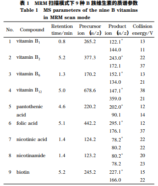 Ultimate 3000 超高效液相色譜儀、TSQ Endura 三重四極桿質(zhì)譜儀(美國 Thermo Fisher 公司);旋渦混合器VORTEX-5(海門市其林貝爾);Sartorius 萬分之一電 子天平(北京賽多利斯公司)。 甲醇、甲酸銨均為色譜純(德國 CNW 公司);甲 酸為色譜純(天津市福晨化學(xué)試劑廠)。維生素 B2 (純度 98. 2%)、維生素 B6(純度 100. 0%)、維生素 B12(純度 90. 5%)、煙酸(純度 99. 8%)、煙酰胺(純 度 99. 9%)均購自中國食品藥品檢定研究院;維生 素 B1(純度 95. 2%)、泛酸(純度 96. 5%)、葉酸(純度 91. 3%)、生 物 素 (純 度 99. 0%)均 購 自 德 國 Dr. Ehrenstorfer公司。實驗用水由 Milli-Q 系統(tǒng)(美國 Millipore 公司)制得。 準確稱取適量標準品,維生素 B1、維生素 B2 和 生物素用甲酸溶解后用甲醇定容,其他標準品均用 甲醇溶解并定容,均置于 100 mL 棕色容量瓶中,配 制標準儲備液。移取各標準儲備液,用甲醇稀釋成 質(zhì)量濃度為 50 mg / L 的混合標準中間液,于-18 ℃ 避光保存。根據(jù)需要用水逐級稀釋,配制成適當(dāng)質(zhì) 量濃度的混合標準溶液,現(xiàn)用現(xiàn)配。